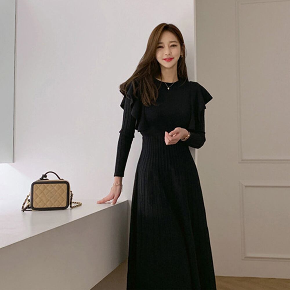 リブニットワンピ 長袖 ウエストマーク プリーツ パーティードレス ロング丈 ハイウエスト 春秋冬 通勤 レディース